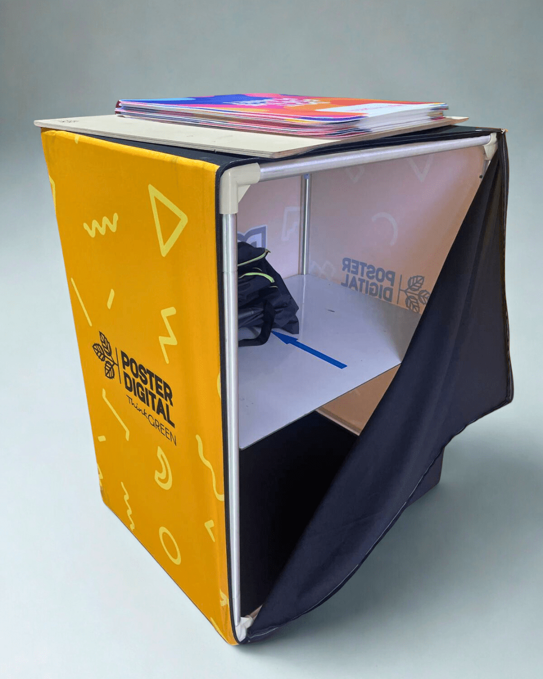A cobertura em tecido têxtil RPET é impressa por sublimação, permitindo gráficos vibrantes e personalizáveis. A sua substituição é simples, possibilitando a renovação da imagem em cada campanha, mantendo a estrutura base.