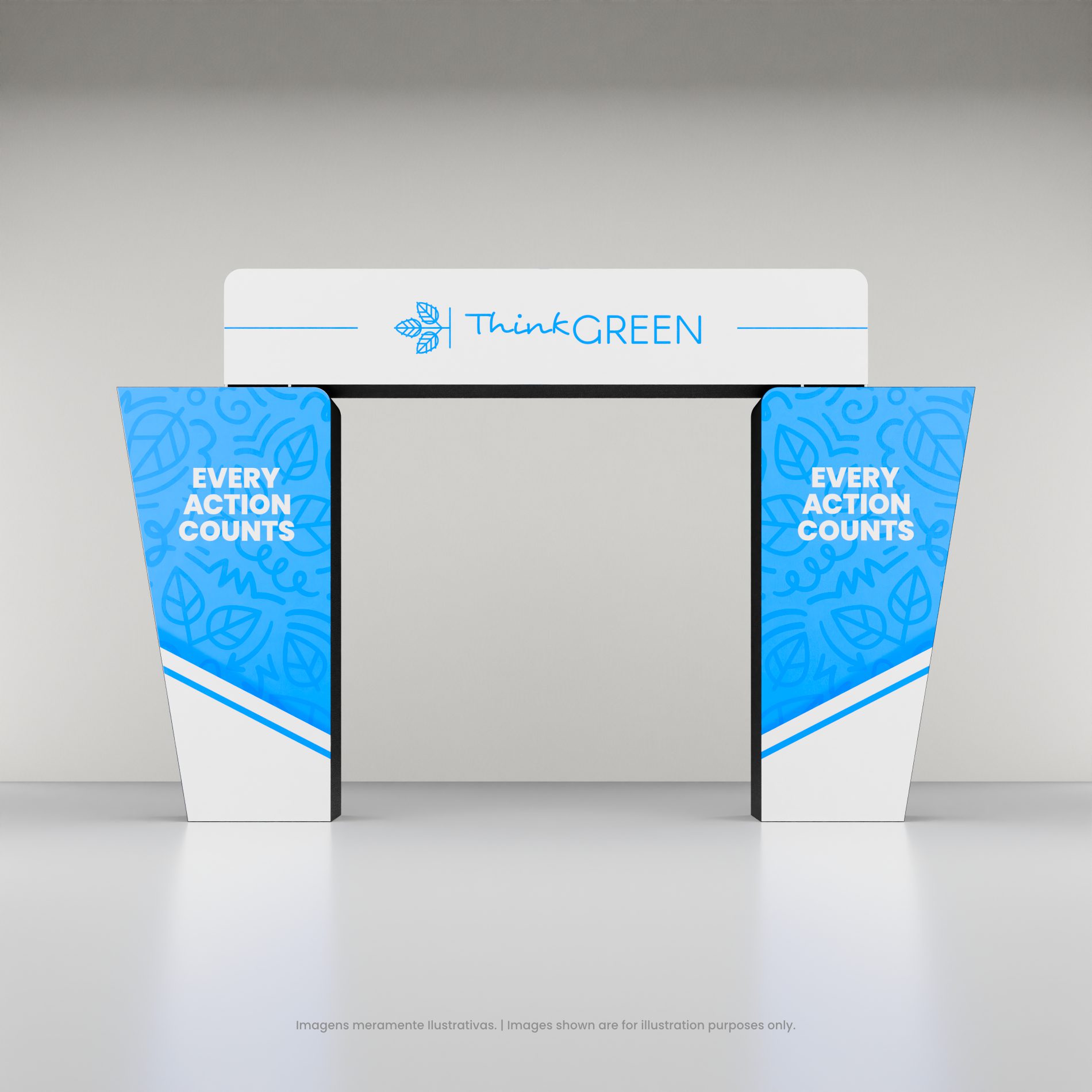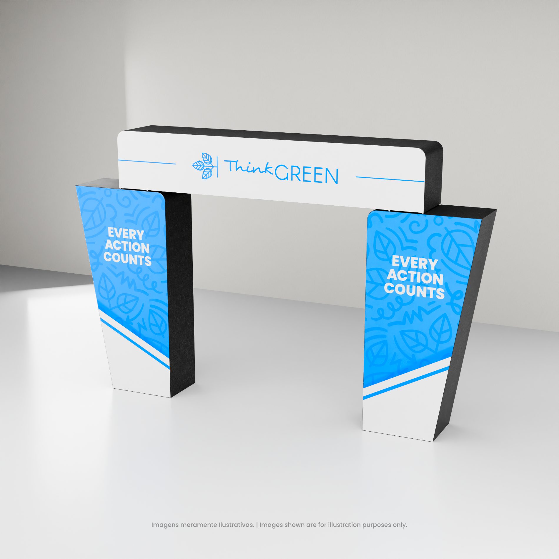 A estrutura tubular em alumínio é leve, resistente e de montagem intuitiva. O seu design modular facilita o transporte, a instalação e a reutilização em múltiplos eventos. O revestimento é feito em tecido reciclado RPET com impressão digital de alta definição, o que garante um acabamento profissional e ecológico.